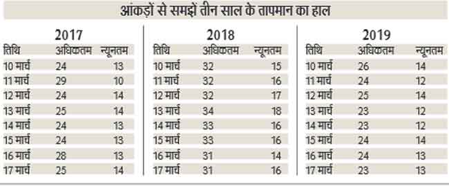 मौसम वैज्ञानिक भी मान रहे हैं कि कई सालों बाद ऐसा देखने को मिल रहा है कि आधा मार्च चला गया और आज भी तापमान 30 डिग्री तक नहीं पहुंचा है। वहीं, मौसम विभाग ने फिर चेता दिया है कि 19 व 20 मार्च को मौसम फिर बदलेगा और तेज हवाओं के साथ बारिश हो सकती है। अगर बारिश हो गई तो तापमान थोड़ा गिर सकता है। पिछले पांच छह सालों में पहली बार होगा जब पूरे मार्च महीने में तापमान 30 डिग्री तक नहीं छू पाएगा।